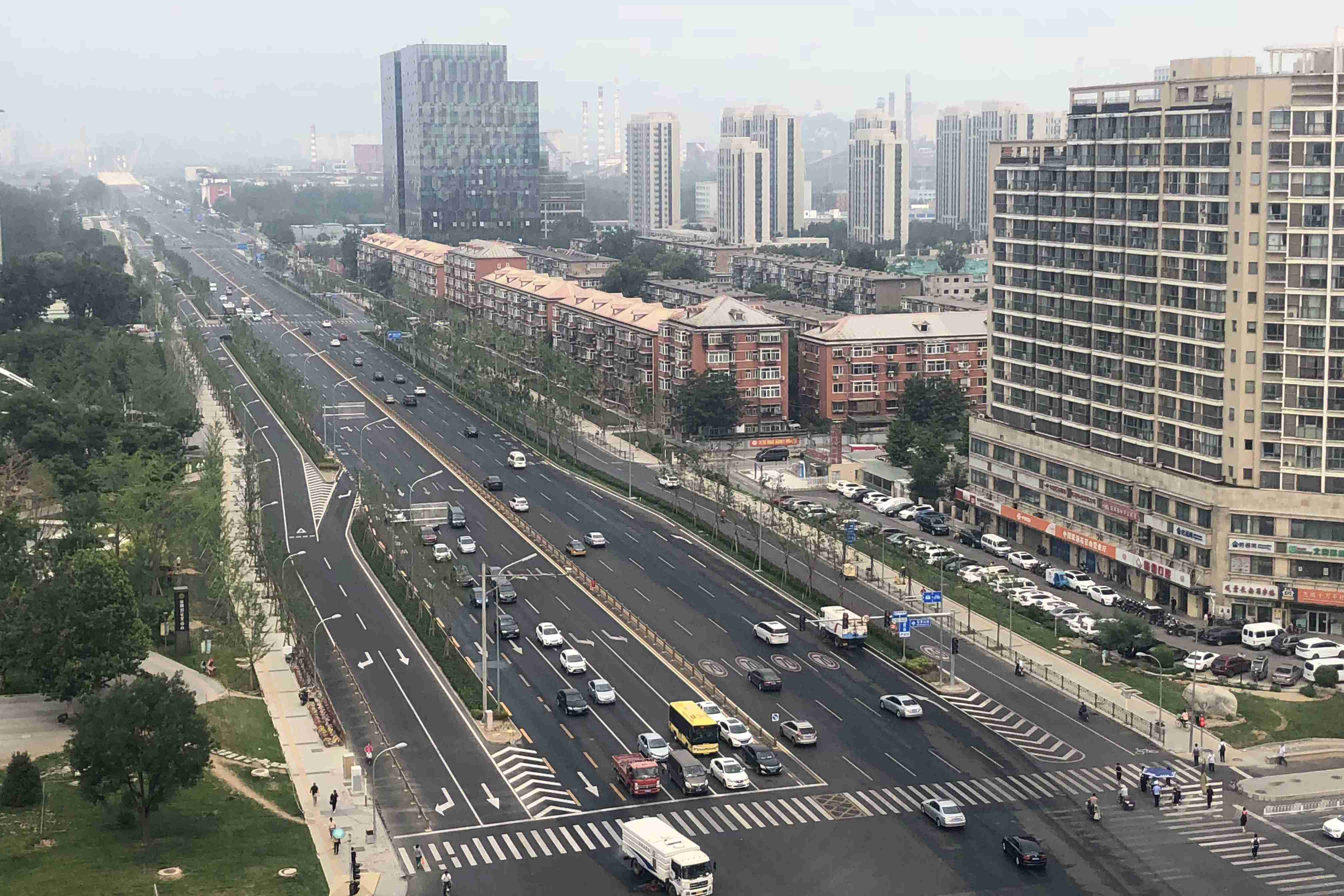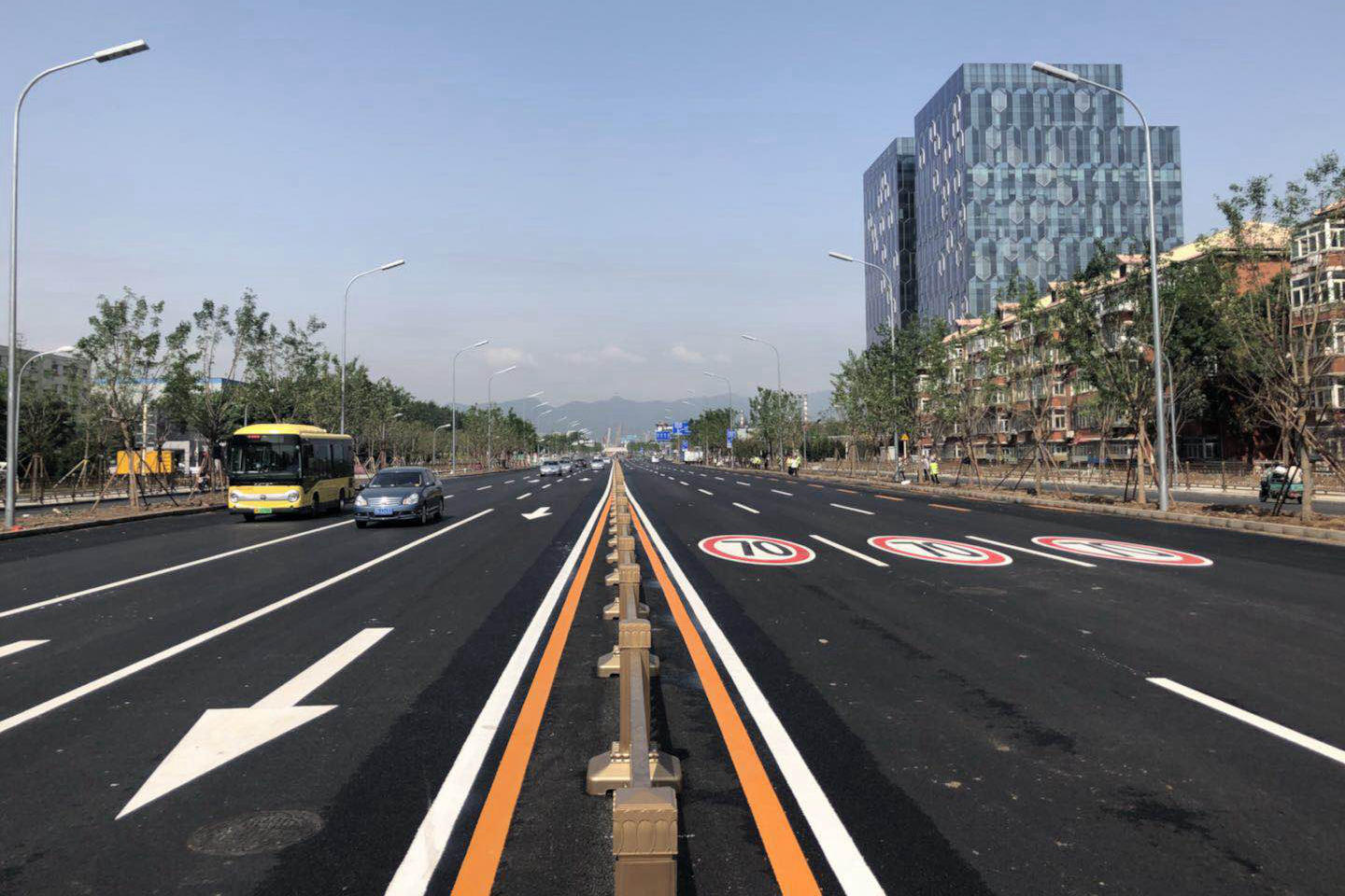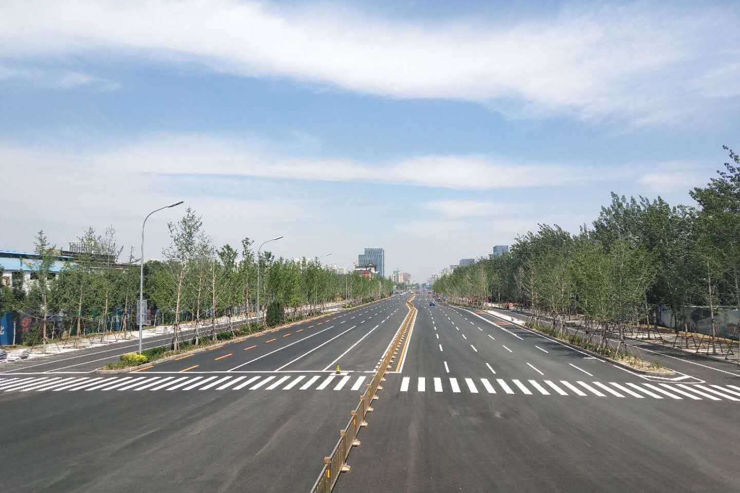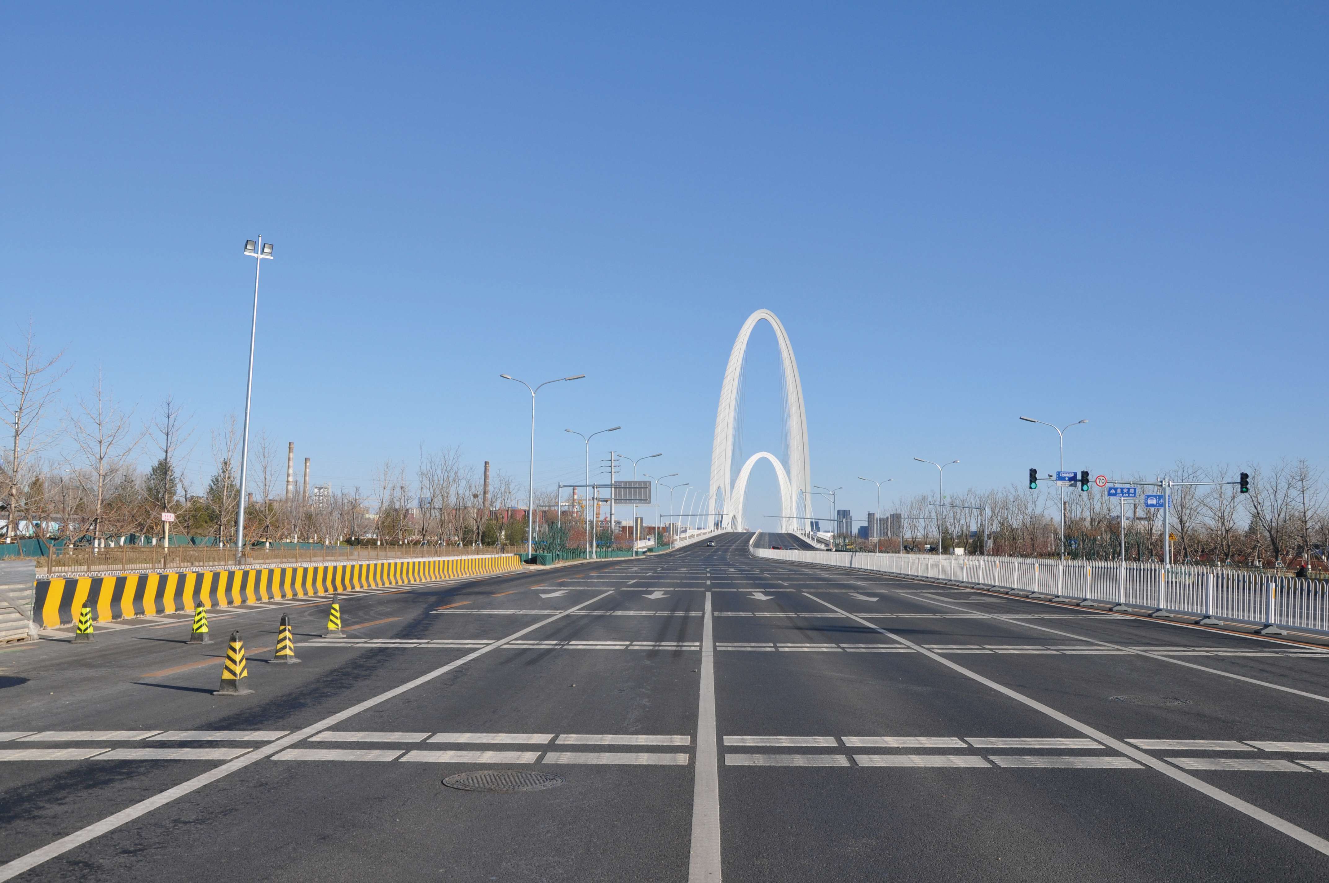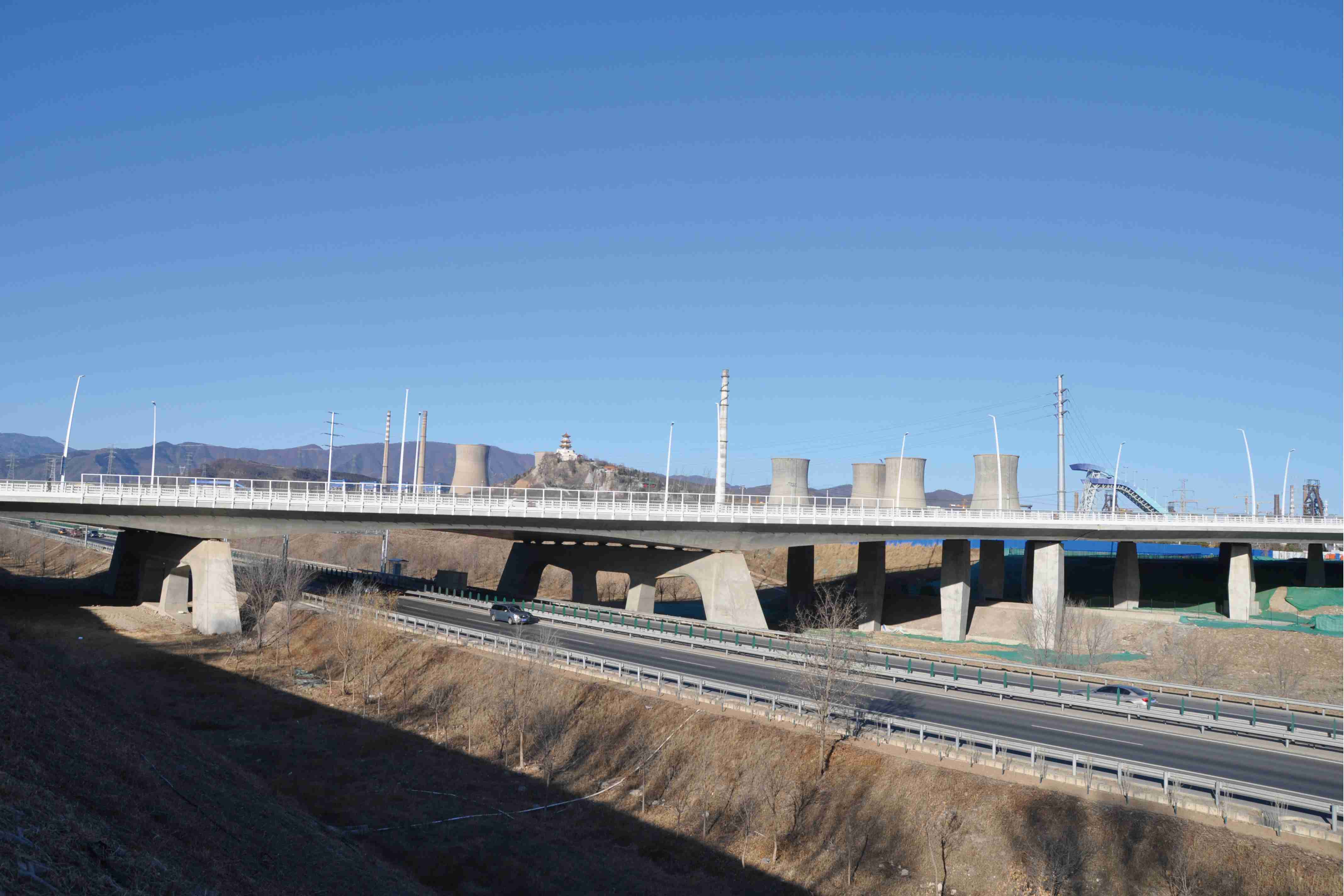 長安街西延線工程東起石景山區(qū)古城大街,向西經(jīng)首鋼主廠區(qū)、上跨豐沙鐵路、永定河及六環(huán)路至門頭溝區(qū)三石路,全長約6.4公里。長安街西延工程道路標準為城市主干路,紅線寬60至100米,古城大街至六環(huán)路西側(cè)路安排4上4下8條機動車道,包括外側(cè)兩條公交專用車道,六環(huán)路西側(cè)路至三石路為包含兩條公交專用道的3上3下6條機動車道。長安街西延道路橫跨永定河,新建跨永定河特大橋一座。長安街西延道路的輔路系統(tǒng)及雨水、綠化、照明、交通工程、環(huán)保、工程改移等工程同步實施。長安街西延跨永定河大橋景觀性標志建筑——雙塔斜拉和剛構(gòu)組合體系橋“和力之門”,橋梁全長1230米,斷面寬度47米,橋梁總面積5.82萬平方米。
